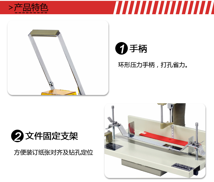 ◆可做国际标准1-22孔5种文件夹打孔装订使用;双支点文件固定支架,方便打孔对齐及钻孔定位;